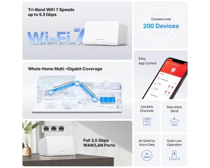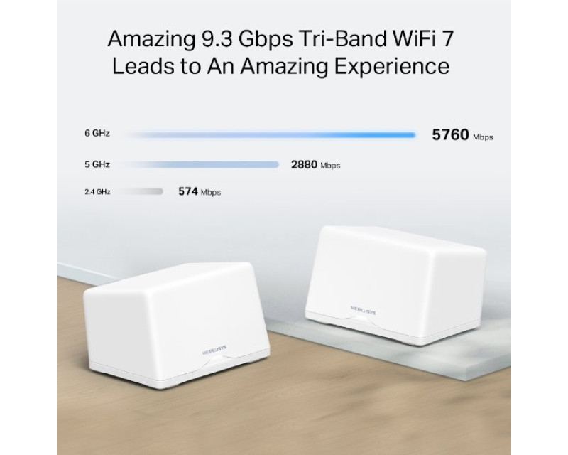 Získejte přístup k třípásmové Wi-Fi 7 s rychlostí až 9 214 Mb/s. V pásmu 6 GHz máte k dispozici rychlost až 5 760 Mb/s, v pásmu 5 GHz až 2 880 Mb/s a v pásmu 2,4 GHz až 574 MB/s. Výkonné zesilovače signálu se postarají o silné a stabilní Wi-Fi připojení. Síť Wi.Fi 7 využívá širší 320MHz a dokáže přenést až o 20 % více dat než Wi-Fi 6.