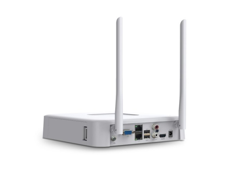 Videorekordér má v sobě zabudovaný reproduktor a po připojení ke kamerám podporuje funkci alarmu. Najdete na něm 1x 10/100Mbps WAN/LAN port, 1x 10/100Mbps LAN port a dva USB 2.0 porty. Současně můžete používat jak HDMI, tak VGA výstup. Vestavěný modul routeru podporuje automatické bezdrátové párování s kamerami pomocí Wi-Fi. Šířka příchozího pásma je 80 Mbps, výstupního 60 Mbps.