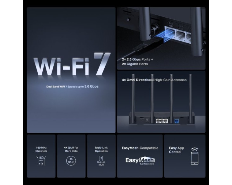 - Bleskově rychlé třípásmové připojení WiFi 7 – celková rychlost až 3,6 Gb/s