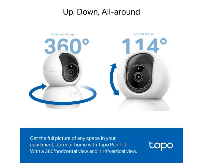 Video kamera nahrává z různých úhlů. Zvládá totiž 360° horizontální a 114° vertikální rotaci. Také můžete využít funkce videa v reálném čase, obousměrný zvuk (mikrofon i reproduktor) a praktickou aplikaci Tapo Camera.