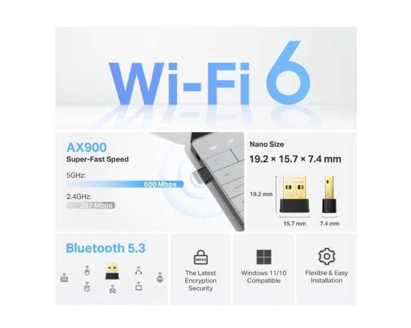 USB klient TP-Link Archer TX10UB vám vám díky dvoupásmové WiFi 6 zajistí kvalitní příjem pro rozsáhlé pokrytí a vysokou rychlost až 900 Mb/s. V pásmu 2,4 GHz dosahuje rychlost hodnoty až 287 Mb/s, v pásmu 5 GHz až 600 MB/s. Bezpečnostní protokol WPA3 zajišťuje vylepšené kybernetické zabezpečení v osobní síti.