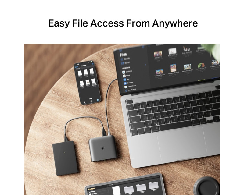 Na routeru najdete 1x plně gigabitový WAN port a 1x gigabitový LAN port pro kvalitní kabelové připojení zařízení, například chytré televize nebo herní konzole. K dispozici máte také USB port pro připojení pevného disku, se kterým tak můžete rychle a bez problému sdílet soubory. Nabíjecí USB-C port využijete v případě, že na cestách potřebujete router dobít pomocí powerbanky.