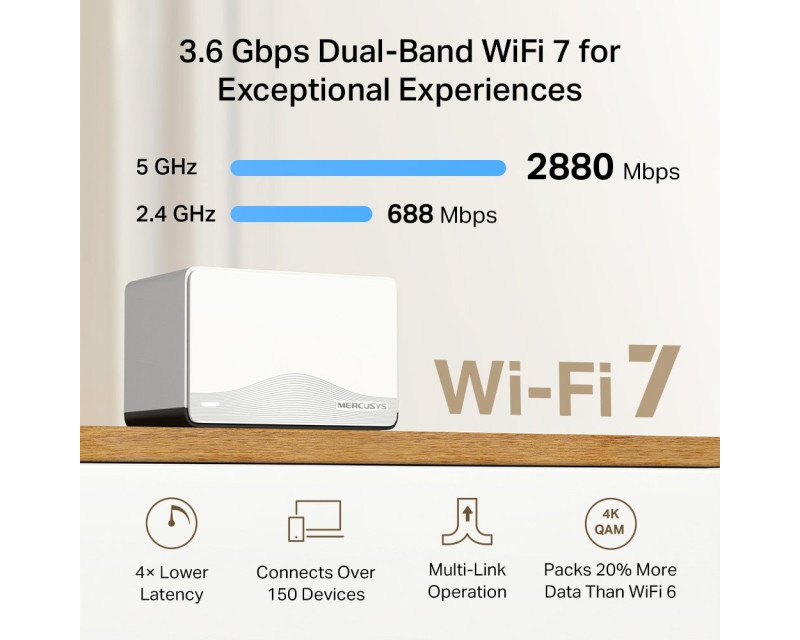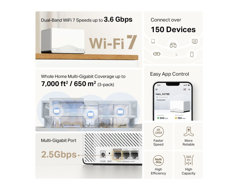 Pomocí routeru TP-Link Mercusys Halo H27BE nerušeně streamujete ve 4K/8K kvalitě a plynule hrajete AR/VR hry s rychlostí až 3,6 Gb/s (2 880 Mb/s v pásmu 5 GHz a 688 Mb/s v pásmu 2,4 GHz). Technologie WiFi 7 totiž posune výkon vašeho domácího připojení na další úroveň. V balení najdete 3 jednotky, které vám zajistí spolehlivé pokrytí (až 650 m²).