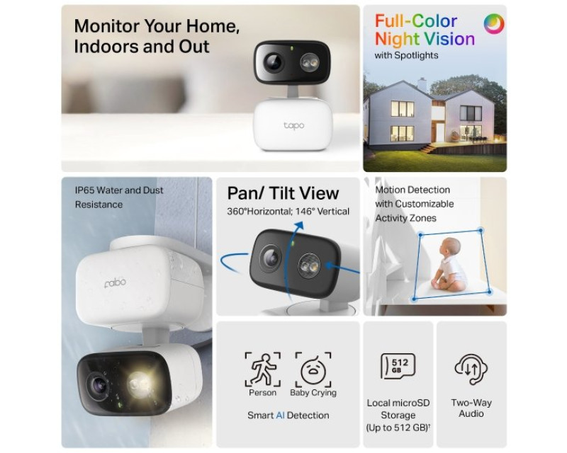 • Úložiště: MicroSD karta (až do 512 GB), Tapo Care Cloud Storage Services