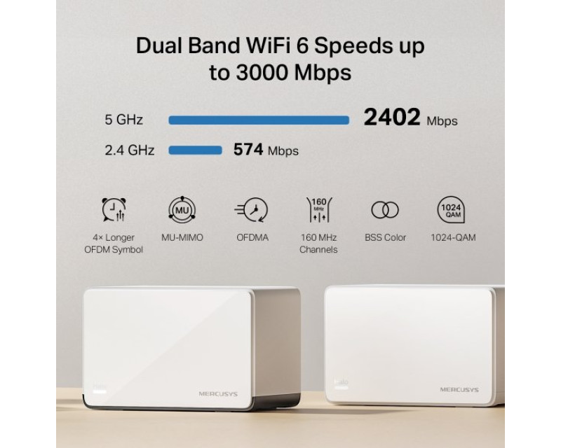 • WiFi router TP-Link Mercusys Halo H85X(2-pack) WiFi 6, AX3000, 1x 2,5GLAN, 2x GLAN2,4/5 GHz