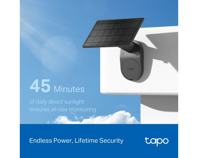 Baterie má velmi nízkou spotřebu a vydrží až 180 dní provozu na jedno nabití. Snadno ji dobijete. Také můžete využít solární panel Tapo A201 (součástí balení), abyste si zajistili nepřetržitý chod. Pouhých 45 minut přímého slunečního záření zajistí celodenní fungování kamery. Nemusíte se tak obávat ani výpadků proudu během letních bouřek.