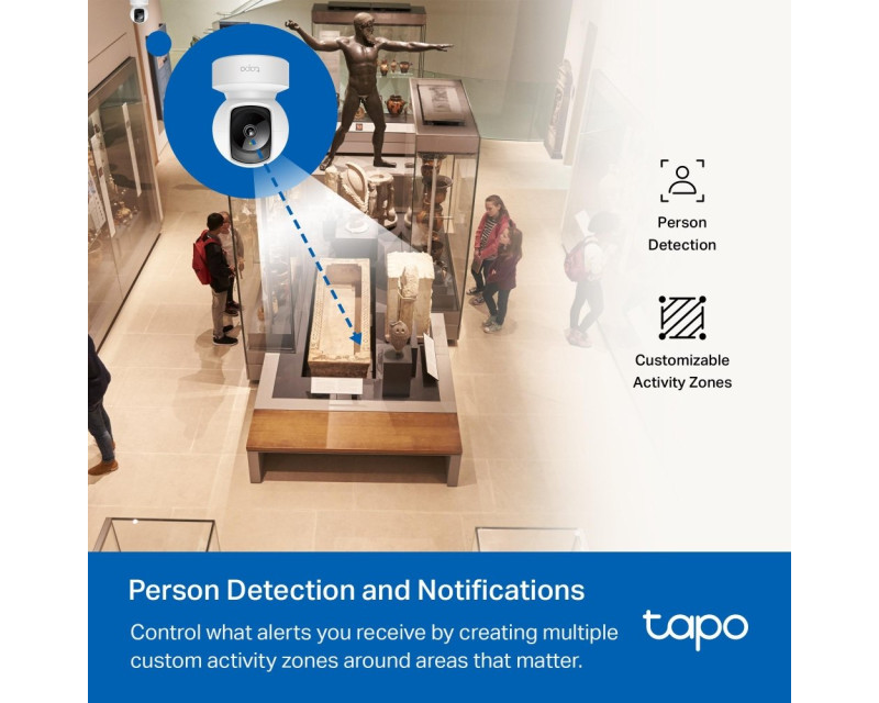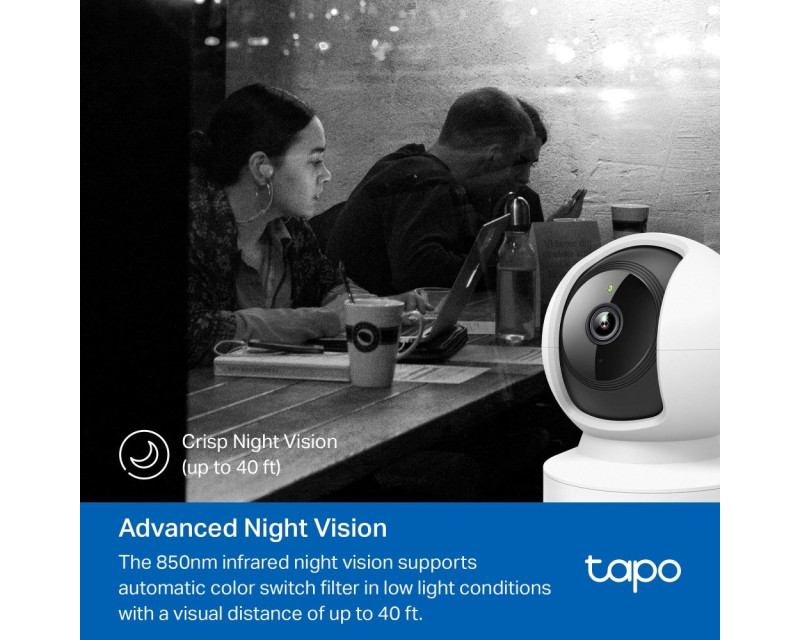 Wi-fi kamera TP-Link Tapo C202 zajistí bezpečí vaší domácnosti. Umožňuje 360° horizontální a 113° vertikální rotaci, natáčení, naklápění a zvládá pokročilé noční vidění. Během něj zaznamenává akci až na vzdálenost 12 metrů. Podporuje karty microSD (až 512 GB). 2megapixelový snímač pořizuje video záznam s vysokým Full HD rozlišením 1 080p.