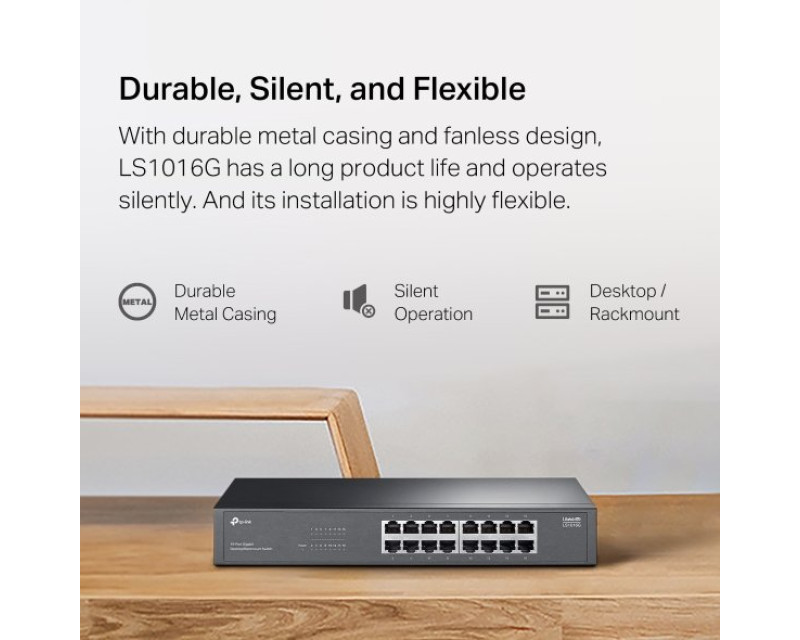 Odolné kovové pouzdro switche chrání vnitřní komponenty před vnějším poškozením a zároveň umožňuje správný odvod tepla. Zajišťuje tím delší životnost. Navíc zařízení snadno umístíte na stůl nebo ho namontujete do racku. Switch je bez ventilátoru a má tichý provoz, proto se hodí do každé domácnosti i firmy.