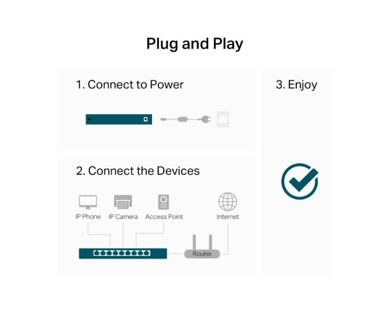 Zprovoznění switche je velmi jednoduché díky funkci Plug and Play. Propojíte ho se zdrojem energie, připojíte k němu svá zařízení a hned ho můžete používat. Nepotřebujete k němu instalovat software či ho složitě nastavovat.