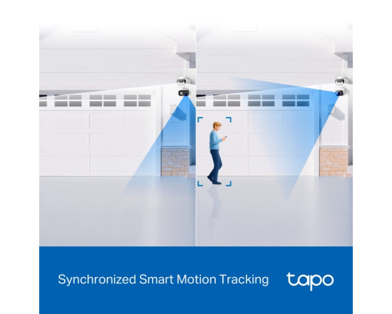 Kamera sleduje dvě oddělené oblasti současně díky kombinaci pevné širokoúhlé čočky a otočné čočky s funkcí pan/tilt. Tato spolupráce minimalizuje slepá místa a umožňuje inteligentní sledování pohybujících se objektů v reálném čase.