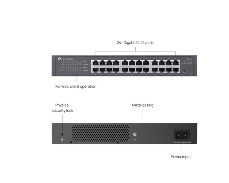 Switch ES224G je navržený pro profesionální, ale zároveň nenáročný provoz. Využijete jej jak v dohledových systémech, tak i v běžném firemním prostředí. Díky plug-and-play funkci je ihned připravený k použití, zatímco centralizovaná správa přes Omada SDN umožňuje pokročilé nastavení a monitoring. Bezventilátorová konstrukce zajistí zcela tichý chod a díky robustnímu kovovému tělu jej snadno namontujete do racku i na stůl.
