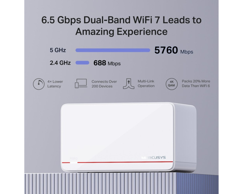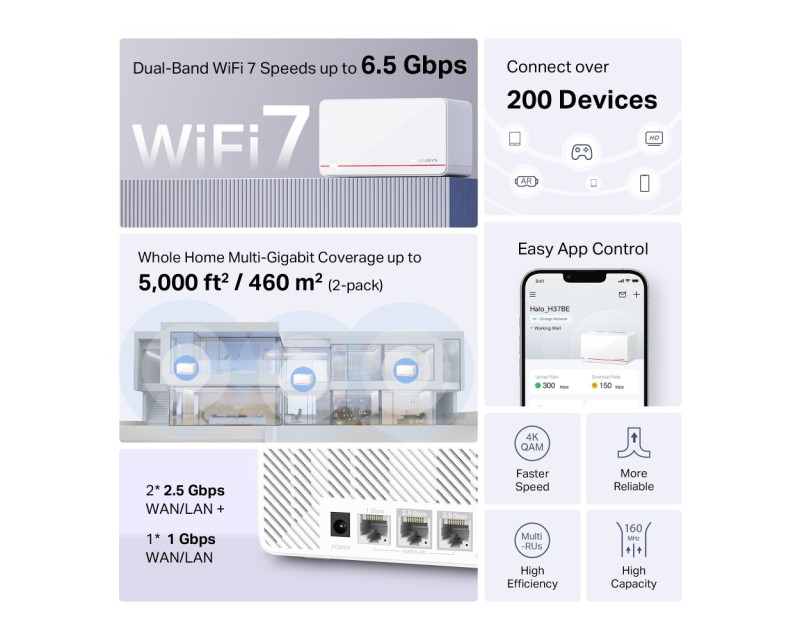 Pomocí routeru TP-Link Mercusys Halo H37BE nerušeně streamujete ve 4K/8K kvalitě a plynule hrajete AR/VR hry s rychlostí až 6,5 Gb/s (5 760 Mb/s v pásmu 5 GHz a 688 Mb/s v pásmu 2,4 GHz). Technologie Wi-Fi 7 totiž posune výkon vašeho domácího připojení na další úroveň. V balení najdete 3 jednotky, které vám zajistí spolehlivé pokrytí (až 650 m2). Připojíte k nim více než 200 zařízení.