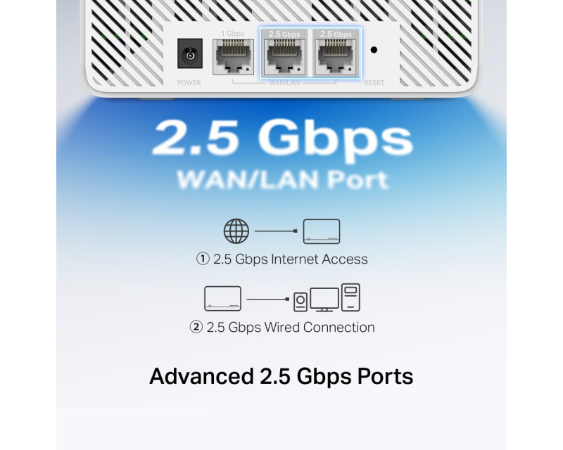 Router je vybavený dvěma WAN/LAN porty s rychlostí 2,5 Gb/s a jedním WAN/LAN portem s rychlostí 1 Gb/s. Snadno k nim připojíte herní konzole, televize a počítače. Využijete tedy plný potenciál routeru.