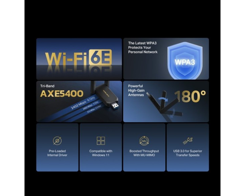 Adaptér MA86XH podporuje nejnovější standard Wi-Fi 6E, který přináší vyšší kapacitu, nižší latenci a rychlejší odezvu. Dvojice externích antén s vysokým ziskem zajišťuje široké pokrytí signálem, a to i ve větších místnostech. Díky podpoře WPA3 budete mít jistotu, že vaše síť i data zůstávají chráněna před útoky.