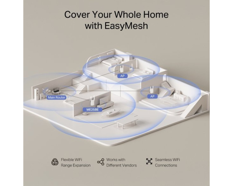 Extender ME25BE lze snadno připojit k internetu přes kabel a proměnit jej v dvoupásmový přístupový bod. Díky technologii EasyMesh můžete zařízení spojit s dalšími kompatibilními produkty a vytvořit jednotnou Wi-Fi síť, která vás nebude přerušovat ani při pohybu mezi místnostmi. Rychlé připojení navíc doplňuje podpora WPA3 pro vyšší bezpečnost.