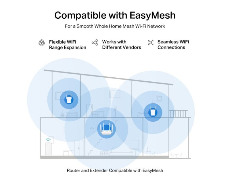 Router disponuje 1× gigabitovým WAN portem a 3× gigabitovými LAN porty. Snadno tedy připojíte PC, chytrou TV nebo herní konzoli. Díky kompatibilitě s EasyMesh vytvoříte jednotnou síť mesh Wi-Fi s dalšími zařízeními bez přerušení signálu při pohybu po domě.
