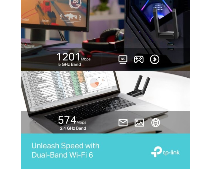 Adaptér Archer TX30U Plus nabízí rychlost až 1201 Mbit/s ve frekvenci 5 GHz a 574 Mbit/s v pásmu 2,4 GHz, takže zvládnete streamování, videohovory i online hraní bez zpoždění. Dvě externí nastavitelné antény s vysokým ziskem ve spojení s technologií Beamforming zajišťují silný signál i ve větších prostorách. Připojení přes USB 3.0 zaručuje minimální latenci a maximální efektivitu.
