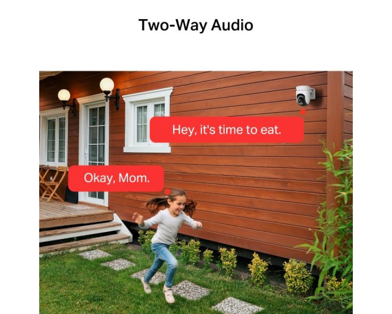 Vestavěný mikrofon a reproduktor poskytují obousměrné audio – můžete tak na dálku komunikovat s návštěvníky nebo doručovateli. Záznamy lze ukládat na microSD kartu až 512 GB nebo využít cloudovou službu MERCUSYS Camera Care.