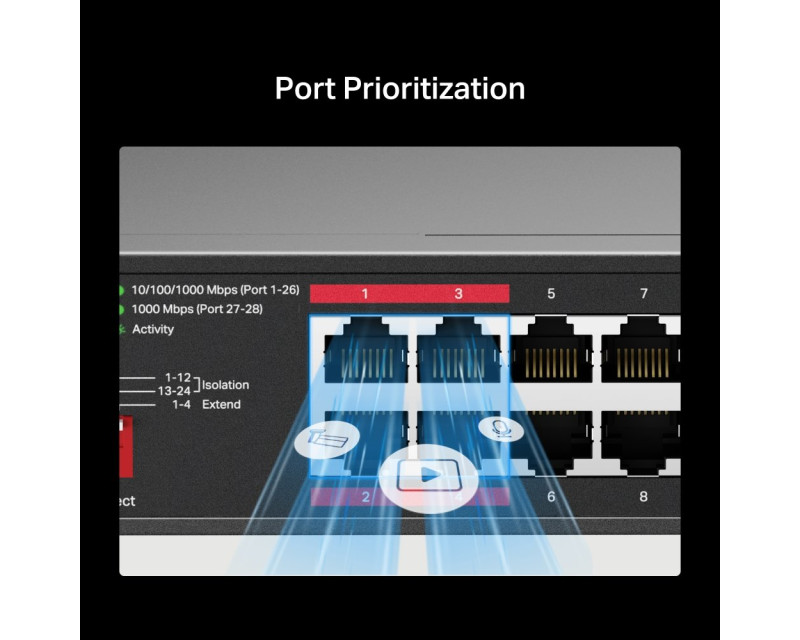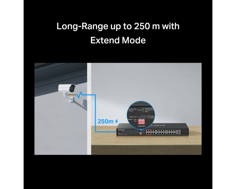 - Režimy: Extend (250 m), Isolation, Priority, PoE Auto Recovery