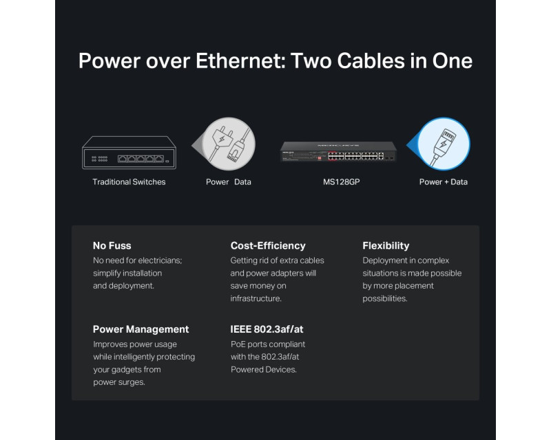 Switch Mercusys MS128GP nabízí 24 PoE+ portů s napájením až 30 W na každý port a celkovým PoE rozpočtem 295 W. Ideální volba pro IP kamery, přístupové body nebo IP telefony v dohledových systémech a menších firmách.
