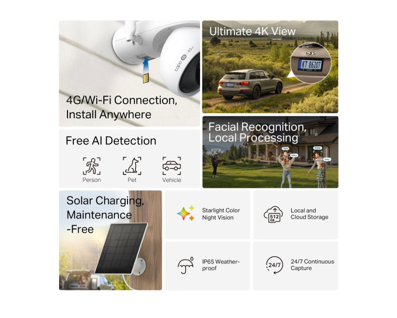 Solárně napájená bezpečnostní kamera TP-Link Tapo C665G KIT 4MPx s 4K rozlišením, Wi-Fi i 4G konektivitou vám poskytne svobodu i v místech bez elektřiny nebo internetu. Využijete ji na chatě, stavbě i na farmě – stačí vložit SIM kartu a můžete monitorovat, co se děje.