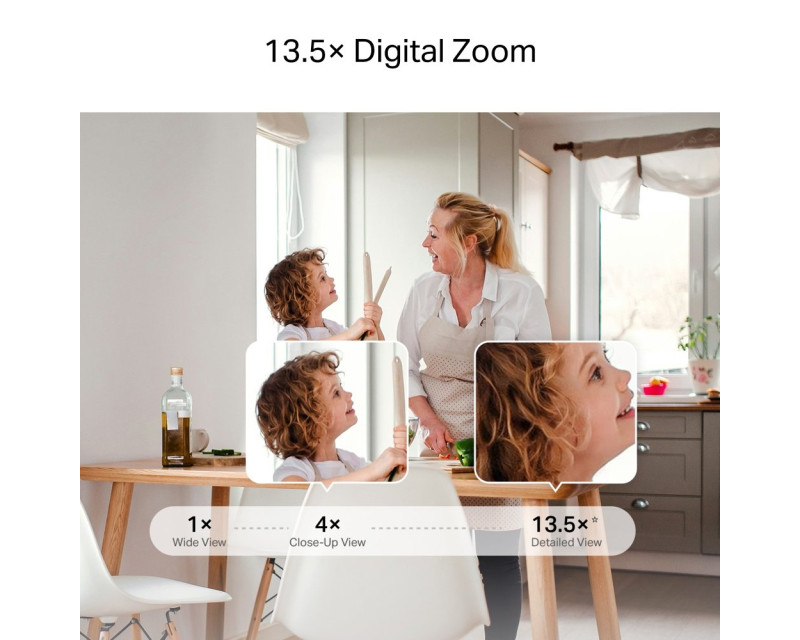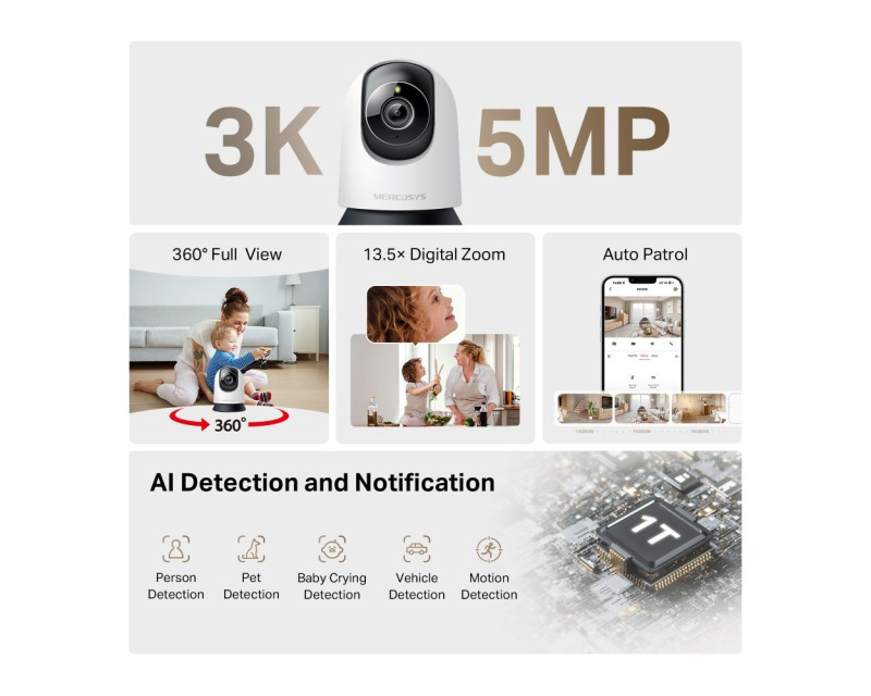 Domácí kamera Mercusys MC230 s rozlišením 5 Mpx přináší ostrý 3K obraz, 13,5× digitální zoom a pokrytí celé místnosti díky otáčení v rozsahu 360°. Inteligentní detekce pohybu, zvuků i objektů zajistí, že máte domov vždy pod kontrolou.