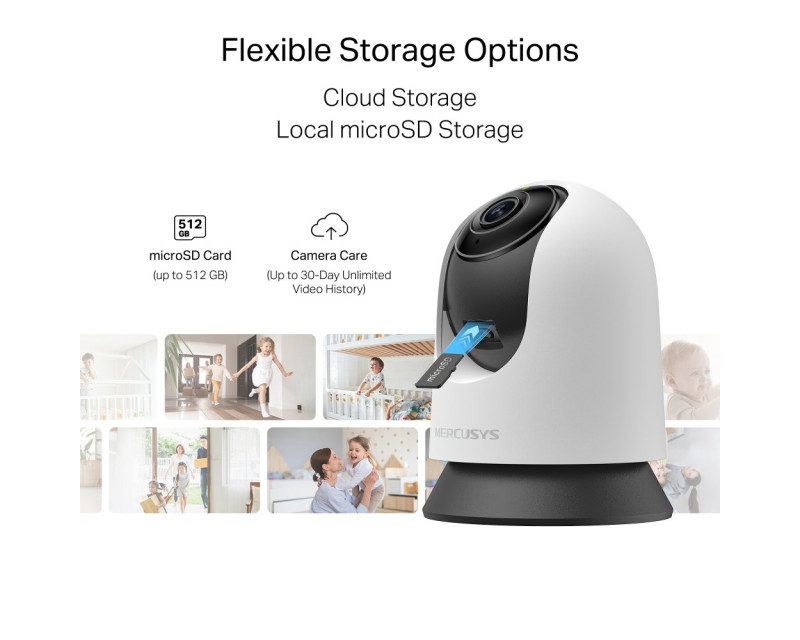 Veškeré videozáznamy můžete ukládat buď lokálně na microSD kartu s kapacitou až 512 GB, nebo bezpečně do cloudového úložiště MERCUSYS Camera Care. Díky tomu máte přístup k historii záznamů odkudkoli a kdykoli.