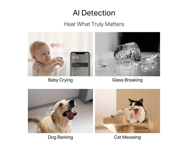 Pokročilá detekce pohybu a zvuku využívá umělou inteligenci k přesné identifikaci osob, zvířat, vozidel nebo dětského pláče. Kamera tak dokáže filtrovat rušivé vlivy a upozornit vás jen na skutečně důležité události. Nechybí ani detekce rozbití skla, štěkotu nebo mňoukání domácích mazlíčků.