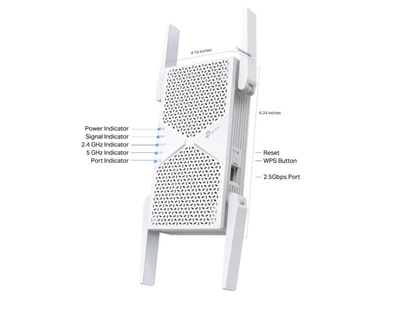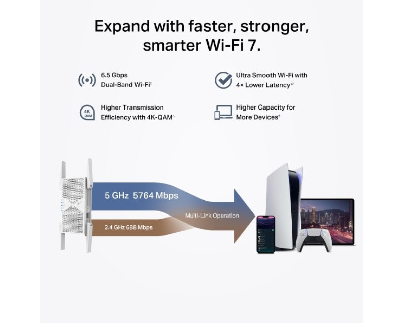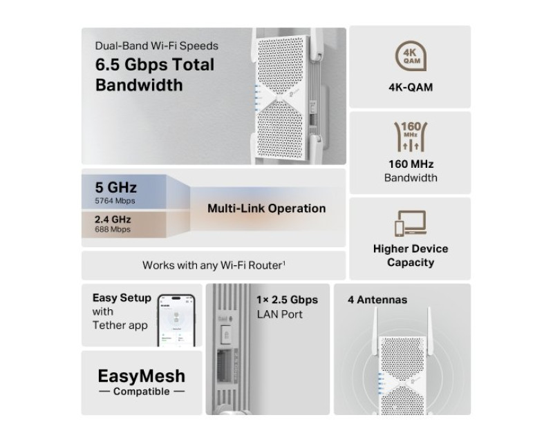 TP-Link RE405BE podporuje nejnovější standard WiFi 7 a nabízí přenosové rychlosti až 6,5 Gb/s. Díky 4 externím anténám a podpoře funkcí jako 4K-QAM, 160 MHz šířka kanálu a Multi-RUs poskytuje široký dosah a vysokou propustnost i pro více zařízení zároveň.