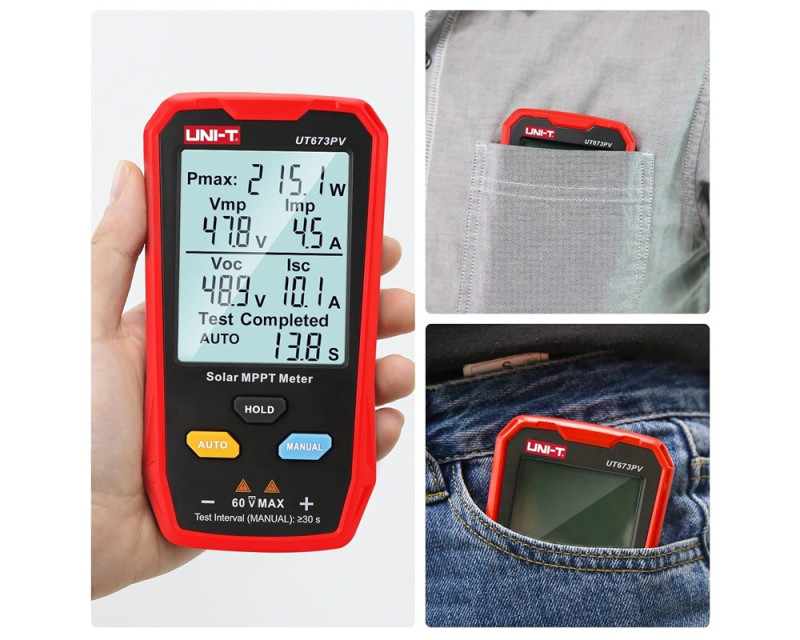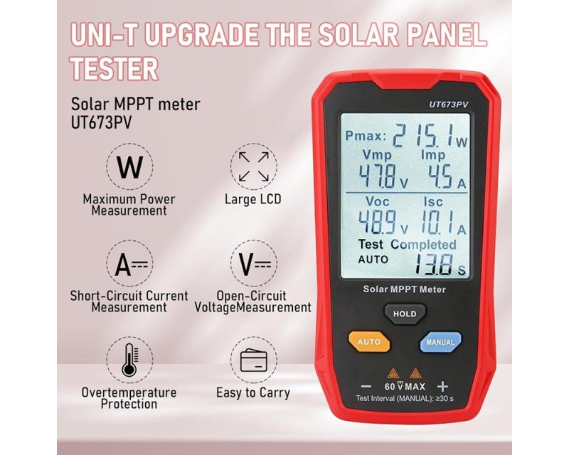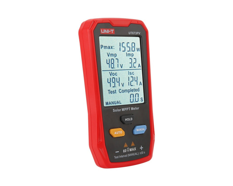 Solární měřič MPPT UT673PV dokáže účinně identifikovat jakékoli abnormality v solárních panelech testováním jejich maximálního výkonu, špičkového napětí, špičkového proudu, napětí při otevřeném obvodu a zkratového proudu. Díky velkému displeji a možnosti automatického měření tento přístroj pohodlně zobrazuje všechny výsledky měření současně. Jeho lehká konstrukce umožňuje snadné přenášení, což výrazně zvyšuje efektivitu provozu a údržby. Aplikační oblasti: výrobci solárních panelů, uživatelé solárních panelů, montážní firmy atd.