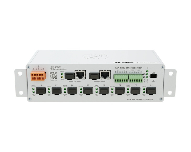 Switche a POE napájení METEL s.r.o. 2G-2C.8S.0.0.G-BOX, Průmyslový managed switch s konfigurací pomocí SSH CLI a SIMULand GUI jsou vybaveny 2x COMBO portem (SFP/RJ45), 8x SFP slot 100BASE-X, 2x DI s podporou vyvážených smyček, 1x programovatelný výstup NO/NC RELAY, 2x RS485 / 1x RS422 BUS (podpora modulů MIOS, TCP server, režim UDP), USB port pro lokální správu, redundantní napájecí vstup, přepěťová ochrana na všech vstupech, EVENT MANAGEMENT: SMTP, události TCP, události ETH, klient HTTP (ovládání kamery), 8x IPWatchdog.... , provozní teplota -40...+75°C, VLAN, QoS, SNMP, SMTP, SNTP, IGMPv1/2, RSTP, LLDP, 802.1X, instalace na rovný podklad nebo DIN35, 10 - 30 VAC / 10 - 60 VDC, spotřeba 13W