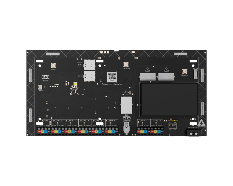 Superior MegaHub je plně vybaven všemi potřebnými komunikátory – nejsou potřeba žádné další moduly. Vestavěné rádiové moduly zajišťují bezproblémové propojení mezi hubem a systémovými zařízeními. Alarmy a události jsou odesílány na monitorovací stanici přes Ethernet, Wi-Fi nebo mobilní komunikaci.