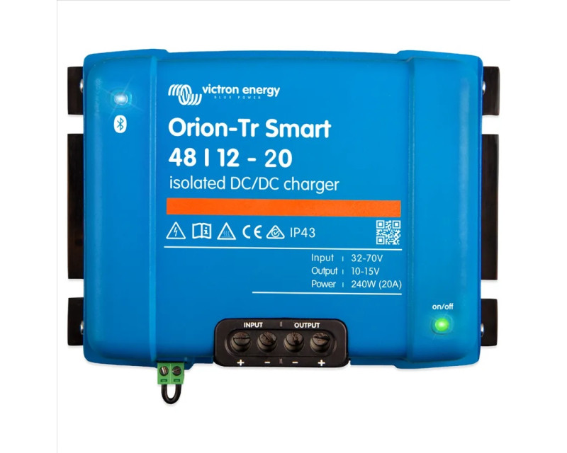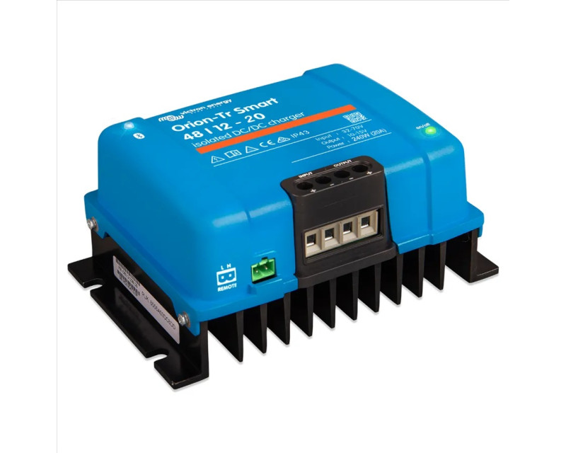 Orion-Tr Smart DC-DC nabíječka 48/12-20 (240 W) od společnosti Victron Energy je vysoce efektivní a plně programovatelné řešení pro nabíjení 12V baterií z 48V systémů. Nabíječka je vybavena galvanickou izolací, adaptivním třístupňovým algoritmem nabíjení a podporou Bluetooth Smart pro snadné nastavování a monitorování pomocí aplikace VictronConnect. Vhodná je zejména pro systémy s inteligentními alternátory a pro aplikace v lodích, obytných vozech či specializovaných mobilních instalacích.