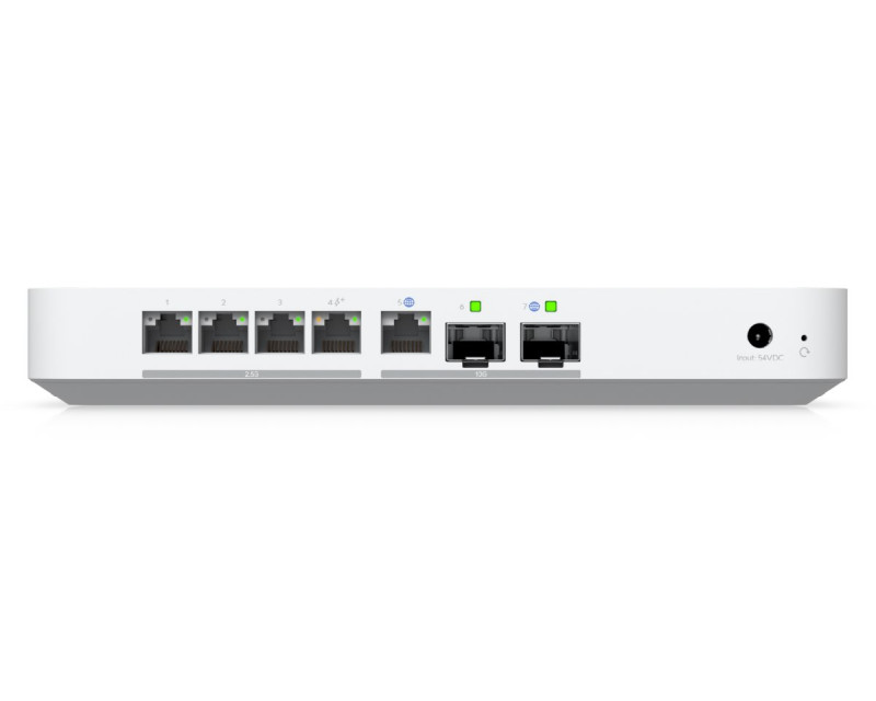 UXG-Fiber je kompaktní 10 gigabitový router, který disponuje (1) WAN 10Gbps portem, (2) 10Gbps SFP+ porty (1x WAN, 1x LAN) a (4) LAN 1/2.5Gbps porty s jedním PoE-OUT portem s podporou PoE+ 802.3af/at. Kompaktní, ale výkonné provedení tak podporuje funkci multi-WAN včetně možnosti load balancing, nechybí podpora IDS/IPS. Router má implementovanou podporu různých typů VPN, včetně site-to-site VPN. Napájení je řešeno prostřednictvím napájecího adaptéru 54V/1,1A, napájecí adaptér je součástí balení.