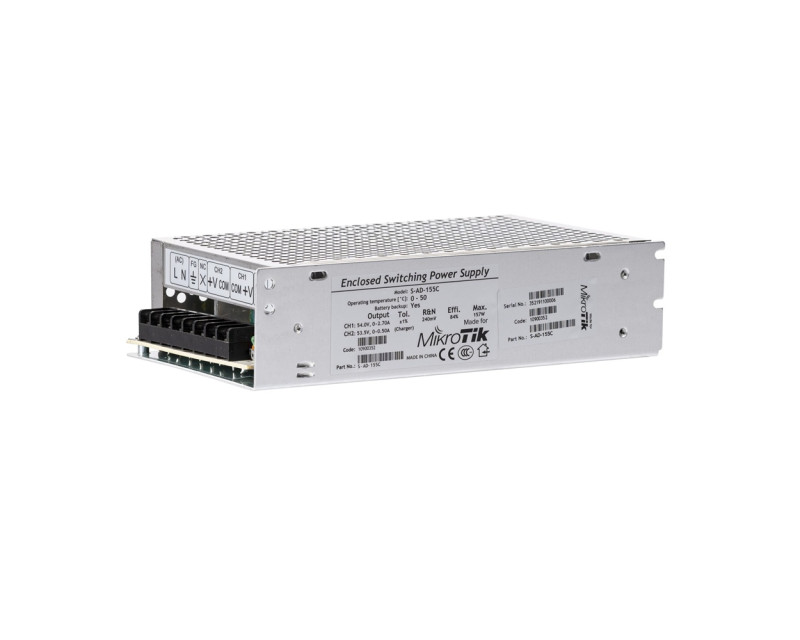 Spínaný průmyslový zdroj Mikrotik OEM s výstupem 54V, maximálním proudem 2,7A a celkovým výstupním výkonem 155W.