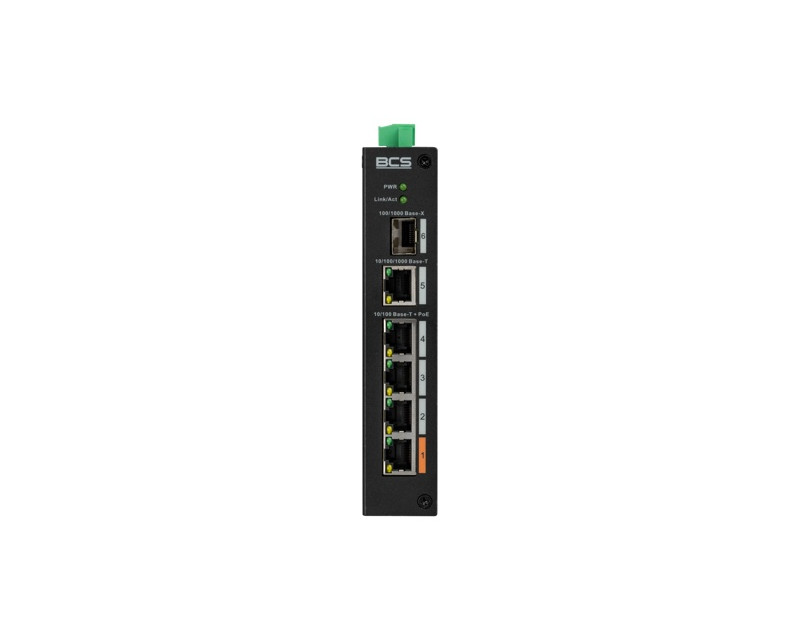 Switche a POE napájení 5portový PoE switch – 4× RJ-45 100Mbps + 1× uplink RJ-45 1Gbps + 1× SFP 1Gbps, standard IEEE 802.3af / 802.3at / 802.3bt / 802.3 / 802.3u / 802.3x / 802.3ab / 802.3z, přenos 10/100/1000 Mbps (half/full duplex, auto-negotiation), přenos paketů 3.57 Mpps, šířka pásma 6.8 Gbps, MAC tabulka 8K, buffer 1 Mbit, režim STANDARD (100 m), EXTEND režim (až 250 m při 10 Mbps, Cat5e/Cat6), PoE pin 1,2,4,5(+), 3,6,7,8(-), stavové LED (PWR, LINK/ACT, PoE), ochrana (ESD 15 kV vzduch / 8 kV kontakt, 2 kV DM / 4 kV CM přepěťová ochrana), DIN lišta, hmotnost 0,45 kg, rozměry 150 × 100 × 30 mm, provozní teploty -30 °C až +65 °C (max. 95 % RH), napájení 53 V DC, PoE výkon celkem max. 60 W (port 1 max. 60 W, porty 2–4 max. 30 W).