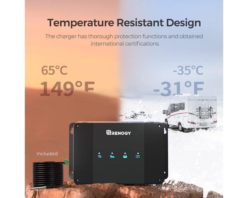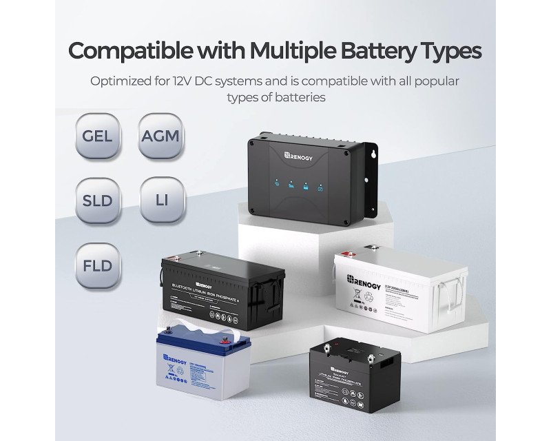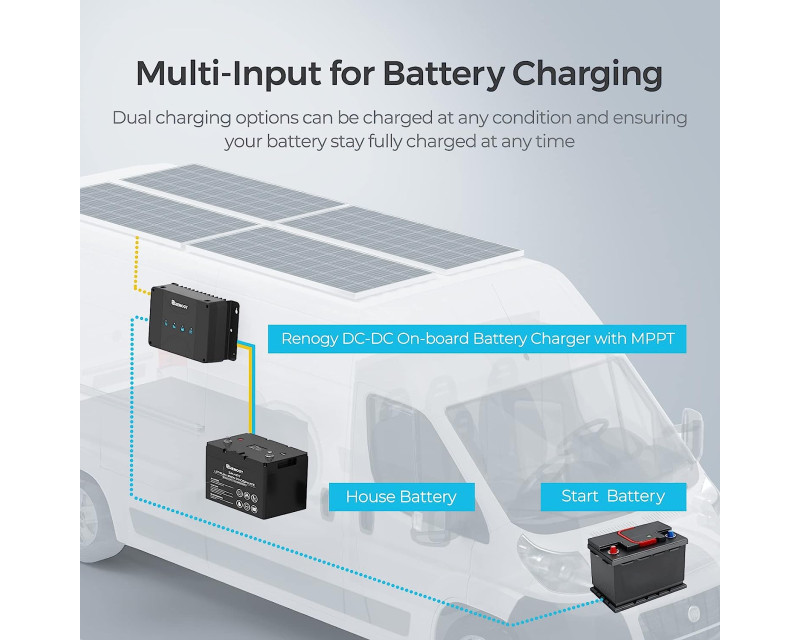 Renogy DC/DC nabíječka baterií s MPPT regulátorem může nabíjet palubní baterii dvěma různými způsoby. Vícestupňová DC/DC nabíječka může využívat jako zdroj elektrické energie připojené solární panely nebo alternátor spojený se startovací baterií.