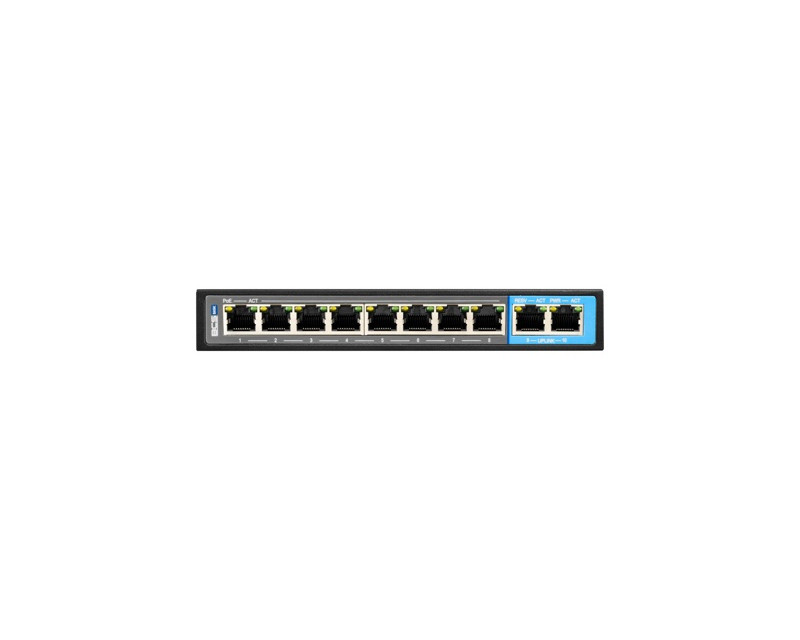 Switche a POE napájení BCS 8portový PoE switch, exPoE, 8× PoE 100 Mbps, 2× RJ45 uplink – přenos 10/100/1000 Mbps (half/full-duplex), auto-negotiation, auto MDI/MDIX, přeposílání 4,17 Mpps, šířka pásma 5,6 Gbps, standardy IEEE 802.3af/802.3at, max. výkon 30 W/port, 96 W celkem, režimy STANDARD / VLAN / EXTEND / PoE / QoS, dosah až 250 m, desktop provedení, napájení 52 V DC / 1,85 A (součástí balení).