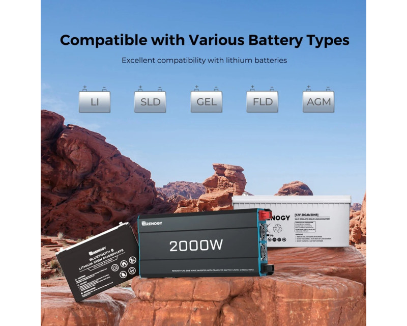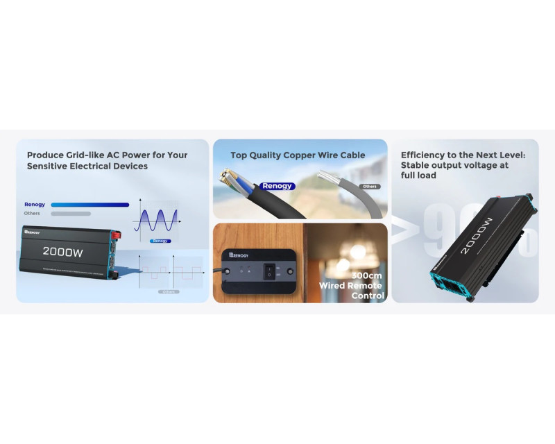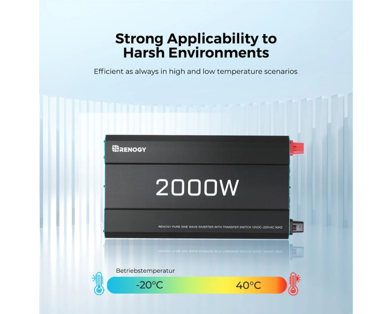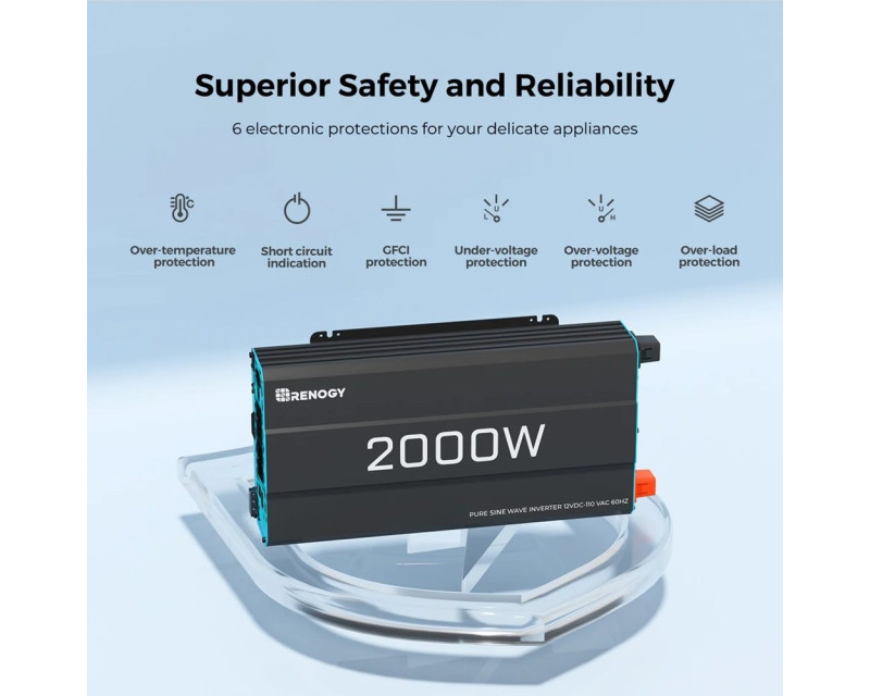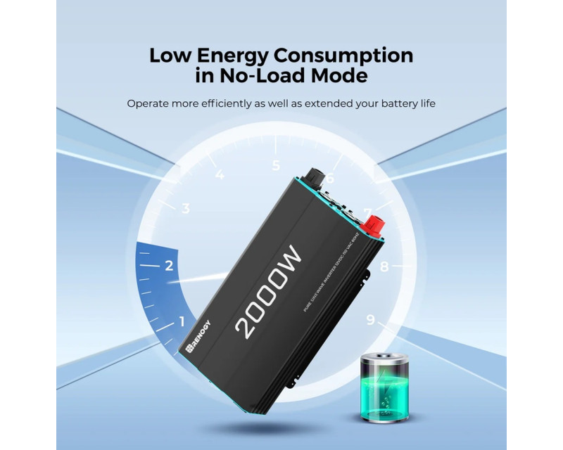 Měnič Renogy poskytuje kontinuální výkon 2000W s možností krátkodobého zatížení až 4000W, což umožňuje napájet i náročnější spotřebiče v karavanu. Pracuje na principu přeměny 12V stejnosměrného proudu z baterie na 230V střídavý proud s frekvencí 50Hz. Výstupní napětí je regulováno s přesností ±3%, čímž zajišťuje bezpečný provoz i pro citlivou elektroniku.