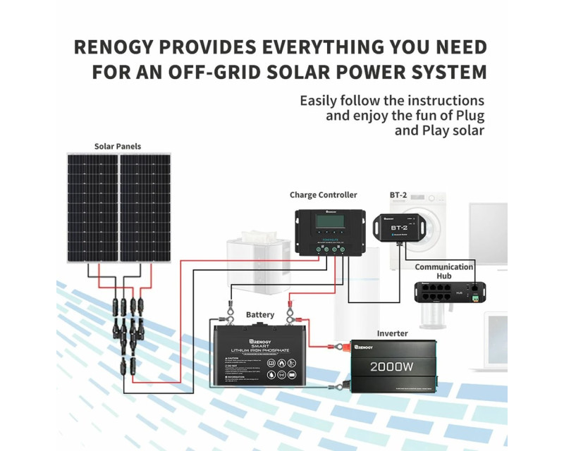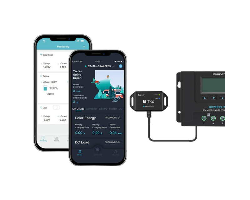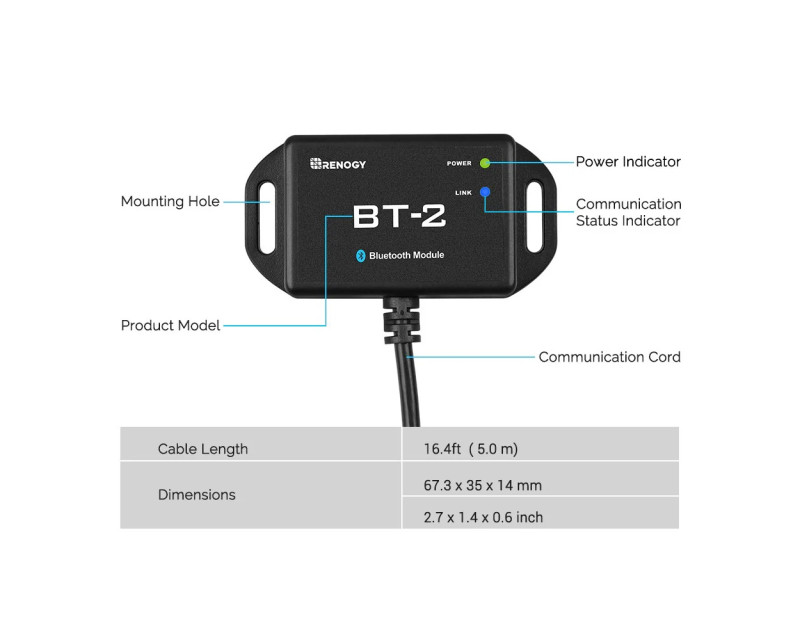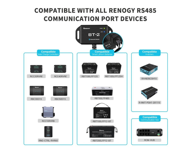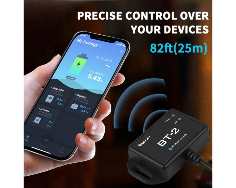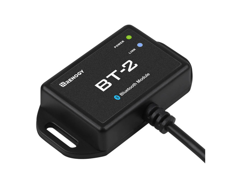 Renogy BT-2 je Bluetooth modul nové generace pro vybrané regulátory solárního nabíjení Renogy, nabíječky baterií DC-DC, chytré lithiové baterie a invertory (měniče). BT-2, připojený přes komunikační port RS485, poskytuje bezdrátové monitorování systémových dat a umožňuje uživatelům měnit parametry prostřednictvím aplikace pro chytré telefony Renogy DC Home. Aplikace Renogy DC Home App může pomoci učinit váš systém napájení mimo síť chytřejším tím, že vám poskytne přístup ke konfiguraci, sledování, aktualizací a diagnostice vašich produktů Renogy z pohodlí vašeho chytrého telefonu nebo tabletu.