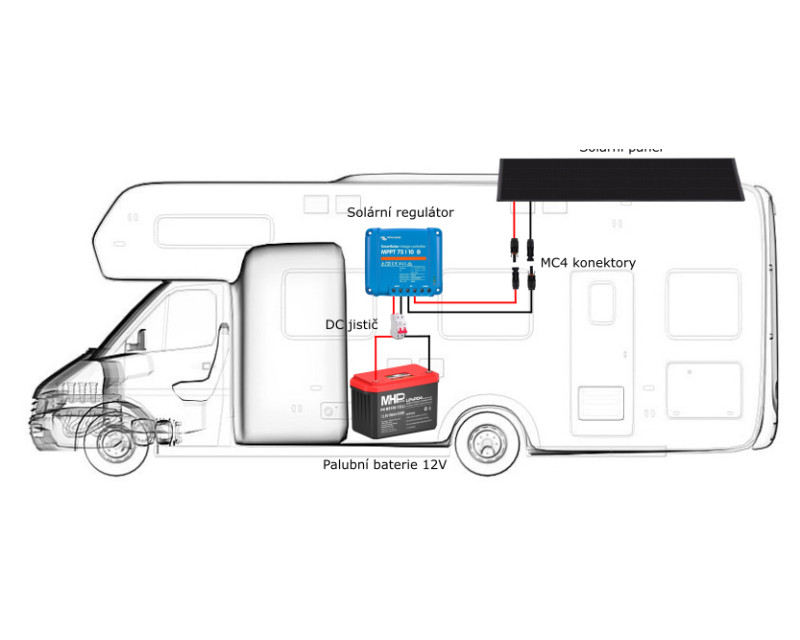 Sestava obsahuje sadu dvou kabelů 10m dlouhých s průřezem 6mm2. Na koncích kabelů jsou nalisovány konektory MC4 sloužící pro připojení k solárnímu panelu. Část kabelu využijete i pro propojení solárního regulátoru a baterie – na tento kabel pouze nainstalujete DC jistič co nejblíže k baterii dle schématu. Instalující elektrikář dovybaví konce kabelů vedoucích do solárního regulátoru dutinkami. U baterie kabel zakončí vhodnými oky, dle typu baterie. Kabelová oka taktéž naleznete v souvisejících produktech.