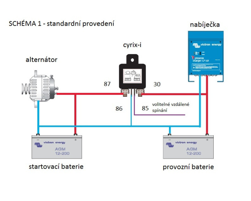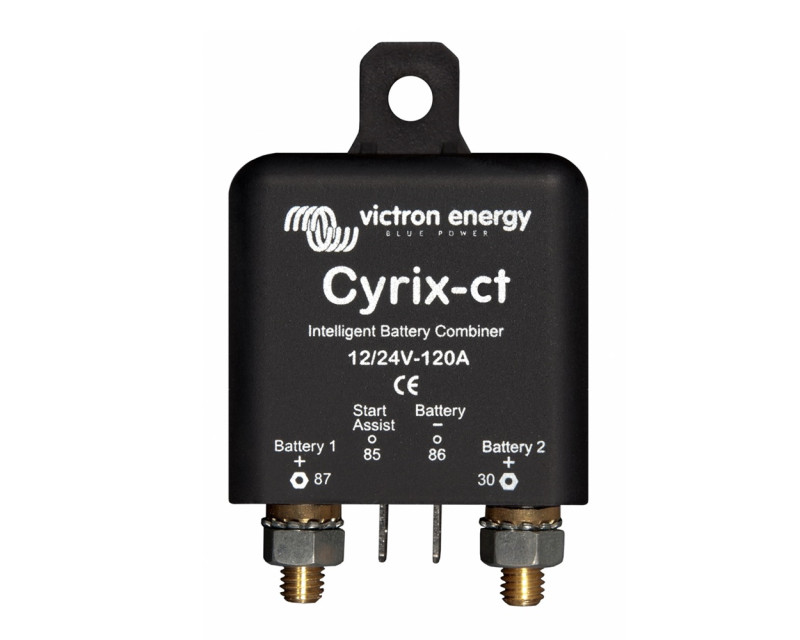 Inteligentní propojovač baterií Cyrix-CT kontroluje a řídí nabíjení, odpojování startovací a provozní baterie. Pokud se na jedné z baterií dosáhne napětí 13,0 V (26 V) po dobu 10 minut nebo 13,8 V (27,6 V) po dobu 4 sekund, Cyrix-ct obojí baterie propojí a nabíjejí se obojí baterie současně do plného stavu.