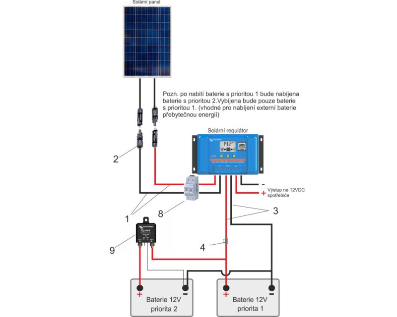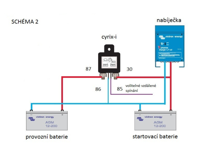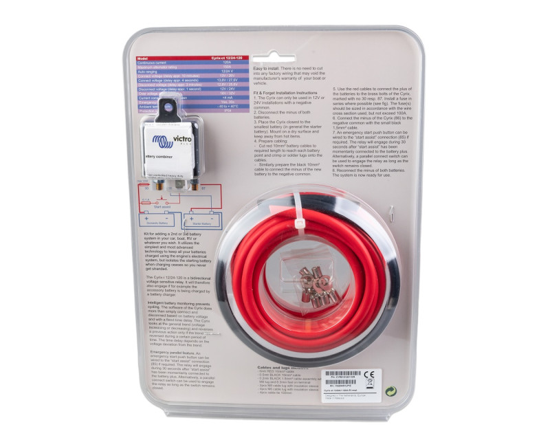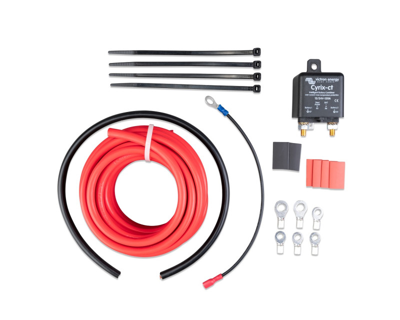 Inteligentní propojovač baterií Cyrix-CT kontroluje a řídí nabíjení, odpojování startovací a provozní baterie. Pokud se na jedné z baterií dosáhne napětí 13,0 V (26 V) po dobu 10 minut nebo 13,8 V (27,6 V) po dobu 4 sekund, Cyrix-ct obojí baterie propojí a nabíjejí se obojí baterie současně do plného stavu.