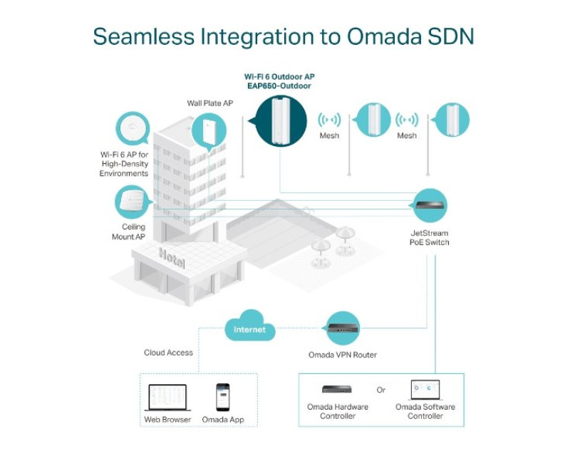 Omada (SDN) patří mezi platformy softwarově definovaných sítí. Sjednocuje síťová zařízení, přístupové body, switche a routery. Tato platforma vám pomůže s cloudovou správou. Vytvoříte sítě, které ovládáte a řídíte z jednoho rozhraní. S přístupovými body Omada EAP a technologií Omada Mesh rozšíříte svůj bezdrátový WiFi signál. Pokryjete i místa, kam není možno zavést kabel.