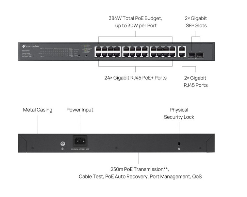 Switch TP-Link ES228GMP využijete v kanceláři, pro maloobchod, univerzitní areál či pohostinství. Zajistí vám vysokorychlostní a spolehlivé spojení s dalšími switchi a zařízeními. Je navíc kompatibilní s IP kamerami, přístupovými body a zařízeními bez PoE (tiskárny a počítače). Najdete na něm celkem 26 10/100/1000Mb/s RJ45 portů a 2 gigabitové SFP sloty. Jejich celkový rozpočet je 384 W, na každý port pak připadá až 30 W.
