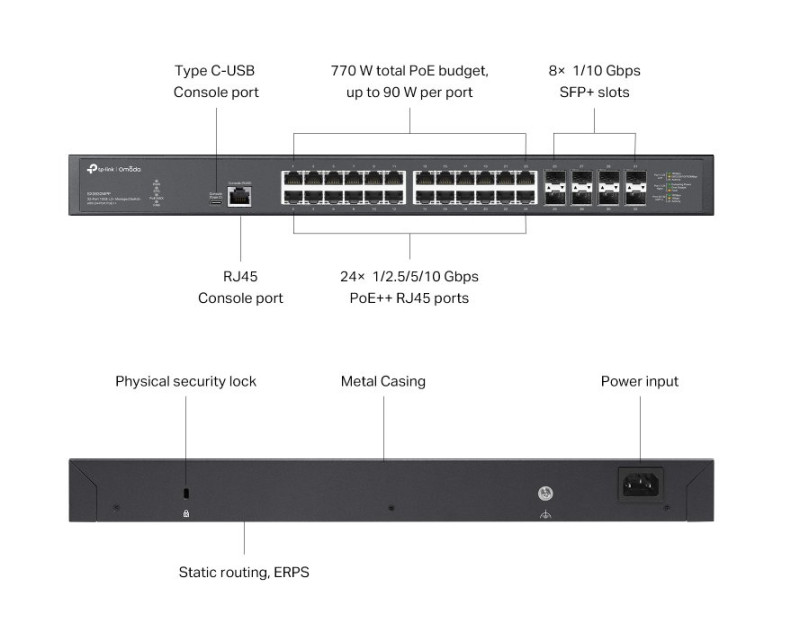 - 24x 100Mbps/1Gbps/2.5Gbps/5Gbps/10Gbps PoE++ RJ45 port (Auto-Negotiation/Auto MDI/MDIX)
