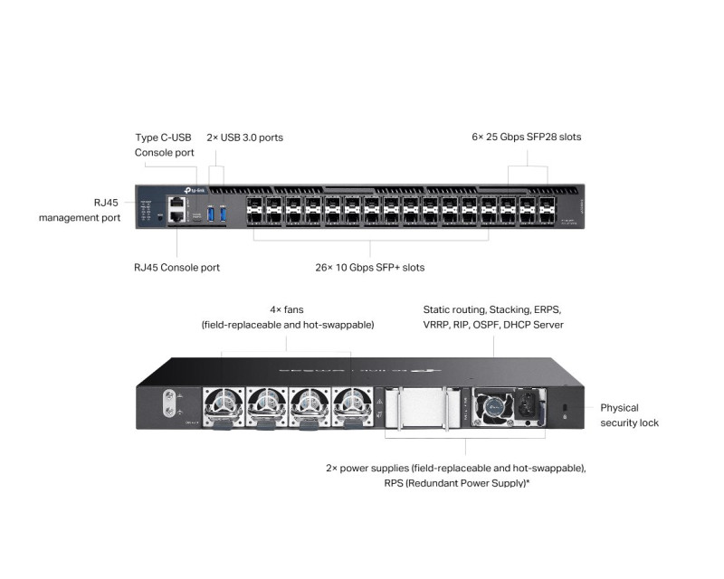- Rozhraní: 6x 10/25G SFP28 slot, 26x 1/10G SFP+ port, 2x USB 3.0 port, 1x RJ45 konzolový port, 1x USB-C konzolový port, 1x RJ45 management port