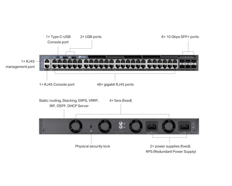 - Rozhraní: 48x 10/100/1000 Mbps RJ45 Port, 6x 10G SFP+ Slot, 2x USB 2.0 Port, 1x RJ45 Console Port, 1x USB Type-C Console Port, 1x RJ45 Management Port