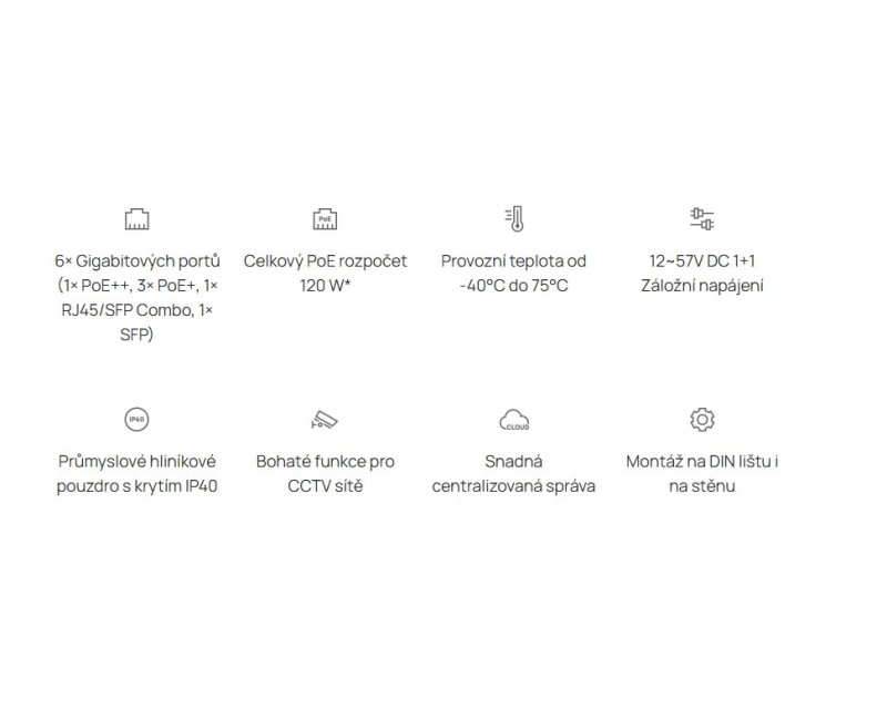- Celkový PoE výkon 120 W je ideální pro zařízení s vysokým odběrem