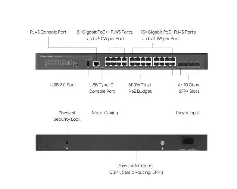 Switch nabízí 24 gigabitových RJ45 portů, z toho 8 portů podporuje PoE++ s výkonem až 90 W a 16 portů PoE+ až 30 W. Díky celkovému PoE rozpočtu 500 W snadno napájí bezdrátové přístupové body, IP kamery nebo VoIP telefony. Funkce Fast PoE a Perpetual PoE zajišťují napájení i během restartu switche.